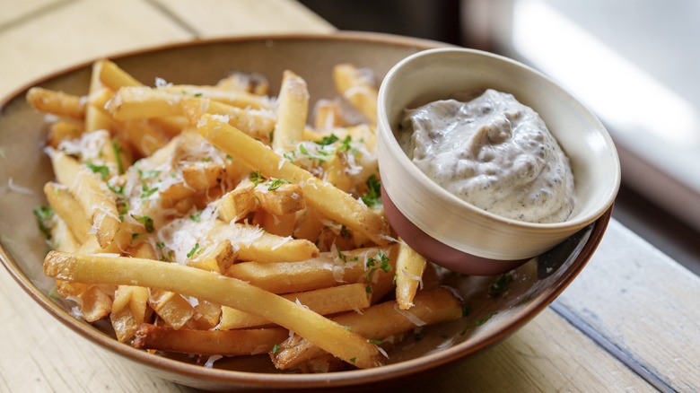 Jumping off from there, you can use your truffle fries to make some truly next-level french fry dishes. Again, you don't need too much here, but the sum of your ingredients will make a truly remarkable dish. Simply grab a skillet with olive oil and fry up some finely chopped garlic with some red pepper flakes, salt, and parsley. Toss this mixture with your truffle fries, and add some grated parmesan for an extra-flavorful bite every time. And if you'd like, add a bit of truffle oil and garlic to some mayo for a simple but delicious dipping sauce. Once you start tossing your fries in truffle oil and experimenting with recipes, you won't want to go back.