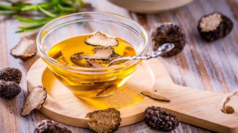 Adding truffle oil to your frozen fries is truly a game-changer, but why stop there? First of all, you have the choice of which truffle oil you'll want to use –- black or white? Black truffles are more readily available, and the oil made with them imparts the same rich, robust flavor that they're famous for. White truffle oil, meanwhile, will carry that lighter peppery, garlicky profile that makes white truffles so delicate and desirable. The general rule of thumb is that black truffle oil is used primarily with meat dishes and other strong flavors, while white truffle oil is better suited for pasta and your new favorite french fries. But no one's saying you can't experiment and see what you like.