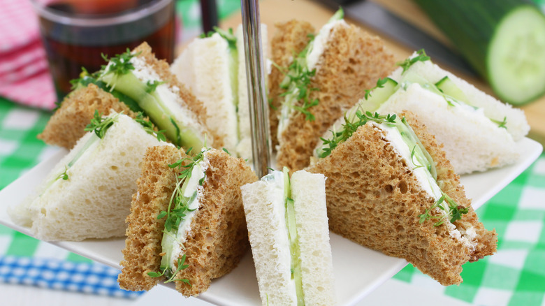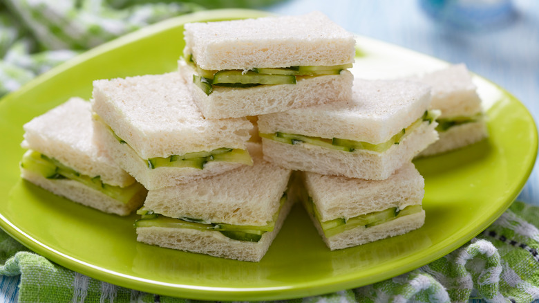 Choosing the right bread for the job is paramount. Traditionally, tea sandwiches are filled with ingredients like cucumber, egg, chicken, crab salad, shrimp, ham and brie, and smoked salmon. For the most part, a simple white bread will more than suffice, and it's even preferred. You want to use bread that won't distract from the more subtle flavors of your sandwich's filling. However, you can opt for rye or pumpernickel if you're using more pungent foods like blue cheese or smoked salmon, which will stand up to more robust breads. While you can certainly bake up your own quick bread, in this case, store-bought is just fine.