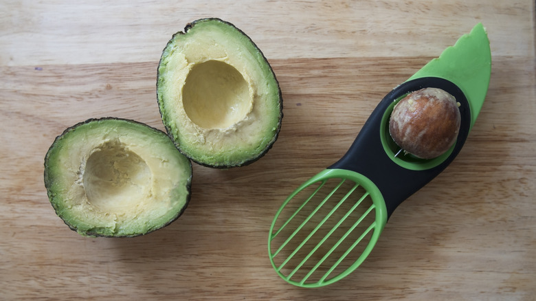Get perfectly sliced avocados without smashing the flesh using an avocado slicer. This gadget halves a ripe avocado, removes the pit, and slices the inside with one swoop. It also makes cleanup easier since you only have to wash one tool. A good avocado slicer includes a blade on one end to cut the avocado, a specially designed section to remove the pit by gripping and twisting, and a scoop that creates perfect avocado slices. The back edge of the tool separates the green flesh from the skin as you pull the tool through the avocado. Some models have a larger scoop that removes the avocado flesh in one large portion rather than thinner slices. Others use a large mesh to cube avocado before scooping it out. All three scoops help get every morsel of avocado out of the skin, resulting in less waste and less mess.