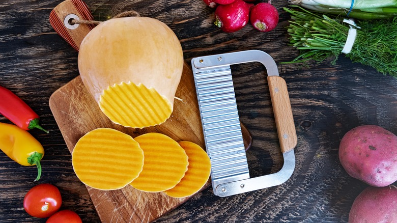 If you're a fan of crinkle-cut fries, you can use this tool to make your own at home. Not only will it save you money over takeout but you can also make the recipe healthier or personalized with your own spice blend. A crinkle-cut knife can be used on everything from cucumbers and carrots to apples and watermelons. You can cut fruits or vegetables to serve raw or cut produce like potatoes, squash, and carrots before roasting them. The special presentation adds some extra style to a fruit or veggie platter. But it really shines as a potato knife for tasty fries. They come out uniform, which helps them cook evenly. A crinkle-cut knife also allows you to control the thickness. You can opt for traditional deep frying or make the recipe healthier by using an air fryer or baking sheet.