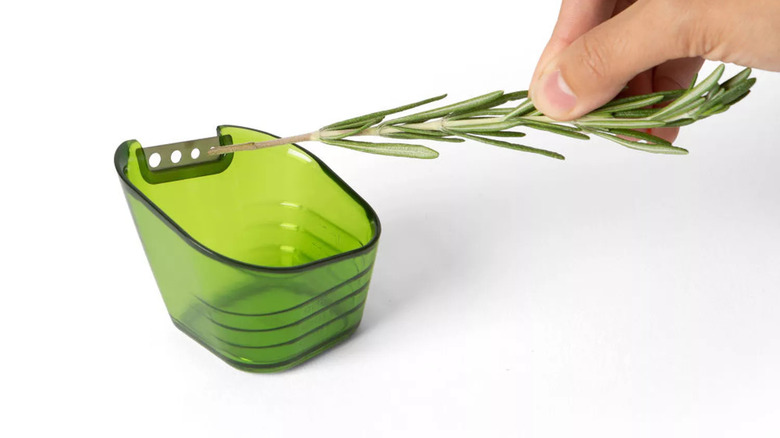 Add flavorful fresh herbs to your dishes and drinks with one hand thanks to an herb stripper. You can remove the leaves and chop the herbs all with the same tool. Some herb strippers, such as those from kitchenware companies like Sur La Table, even include a bowl to collect the stems or leaves to be used in your dish. Many herb scrapers include helpful diagrams and graphics to guide you to the right slot for your herbs, whether it's a plant with a thicker, woody stem or one that is thin and delicate. If you want even more utility, consider an herb scraper with an edge that can chop your fresh herbs as well.