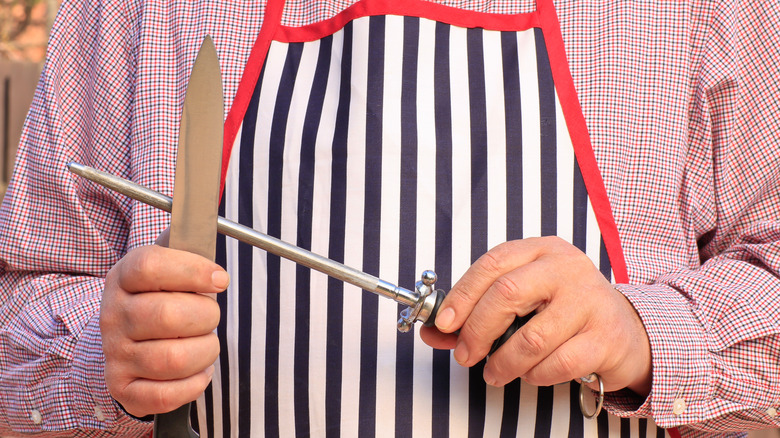 Keep in mind that a honing rod keeps your knives straight but won't sharpen your knives by removing metal. Instead, it straightens the tiny metal fibers at the edge. Your knife should be sharpened in order for honing to be effective. To use a honing rod, experts at America's Test Kitchen recommend holding the blade at a 15-degree angle relative to the honing rod. Keep the honing rod vertical and move the knife over the surface gently. Make sure to run both sides of the knife over the honing rod equally. Only slight pressure is required as you move the blade along the rod. Doing this will ensure that the edge is smooth. This straightens the metal at the edge of the knife, which can become bent with repeated use. With routine use, you will notice that your knives make cleaner, safer cuts.