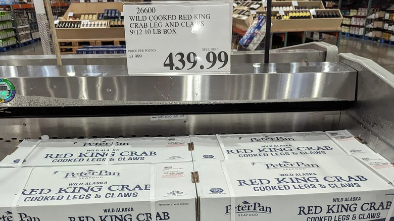 Costco is selling wild-caught king crab legs for $43.99 per pound, according to a Reddit post from a customer who snapped a picture of the price tag. But of course, they're not selling it by the pound. This is Costco after all, and in keeping with their bulk-buying ethos, the king crab is offered in 10-pound boxes — that's $439.99 for a box. This price is much higher than Costco's previous king crab deals, but it has been years since this kind of crab has appeared at the store. Serious concerns about overfishing have put king crab populations at risk, and thrown its future as a culinary delicacy into question.