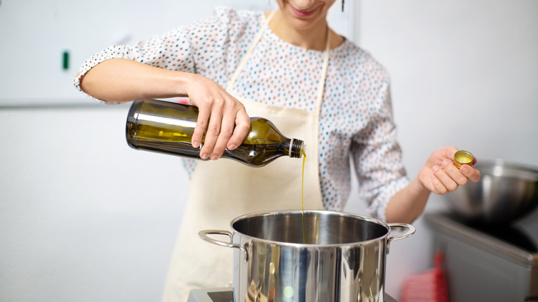 Others add a glug of oil to the pot of water for a different reason: to prevent the pot from boiling over. The thinking behind it is that the pasta releases starch into the water which, when brought to a boil, creates thick bubbles that gum together and can eventually cause the pot to boil over. Adding a bit of oil effectively reduces the water's surface tension and keeps the bubbles from sticking together.