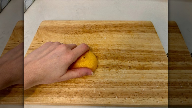 Cut a lemon in half. Place the lemon cut side down on the cutting board. Rub the lemon over the cutting board and salt, using small circular motions to exfoliate the board's surface gently. This will help you get into light cracks and fill them out, while the lemon juice will deodorize.