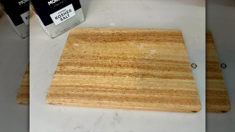Place the board on a flat, stable surface, such as the bottom of the sink or on a countertop. Then, while the cutting board is still damp, sprinkle it with coarse salt. The dampness will help the salt stick initially.