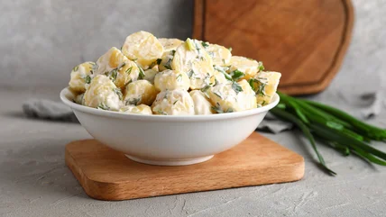 If you have a mayo-based potato salad that's tossed in the air fryer, the high heat combined with the mayonnaise's oil will rapidly cause those potatoes to crisp up, creating a crunchy, delicious variation of the salad. A little oil goes a long way, so don't add the potato salad to the air fryer with large chunks of mayo on it; you can always wipe some of it off. Quick air fryer hack: To prevent mayo from getting all over the air fryer, you might want to add some foil or parchment paper to the basket. This new, crunchy salad will be done in less than 30 minutes when fried at 350 degrees Fahrenheit, but give the potatoes a toss halfway through to make sure they fry evenly.