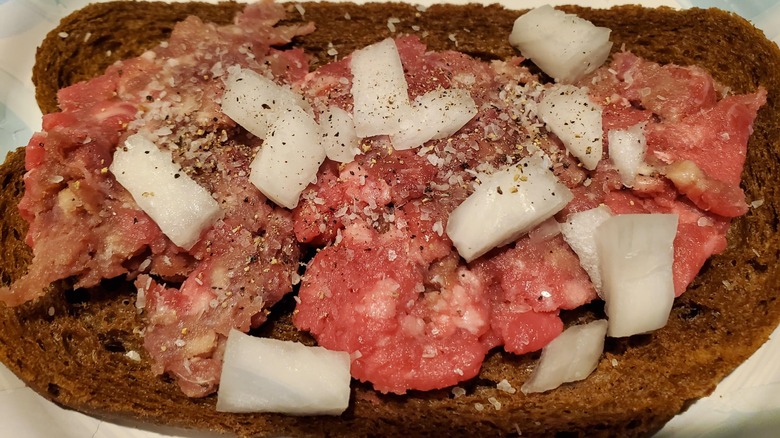 Christmastime at a Wisconsin table features American holiday staples like ham, mashed potatoes, and cookies, but the appetizer course often features something that would shock non-Midwesterners. It's called a cannibal sandwich, even though it's not exactly a sandwich, and does not, in fact, involve Hannibal Lecter's favorite activity. The dish is quite simple — a slice of rye bread topped with raw ground beef and a few slices of onion (also raw). The meat is typically seasoned with salt and pepper and doesn't have much of a taste on its own. The focus is more on texture, with the soft, spreadable meat contrasting the crusty bread and crisp onions.