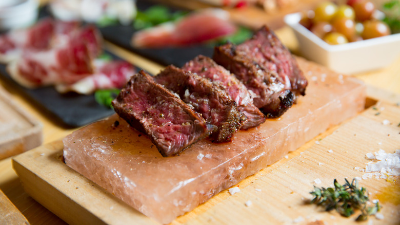 Himalayan pink salt is popularly used as a finishing salt for steaks, but did you know you can also use it to cook steaks? A Himalayan salt block is exactly what it sounds like — a big slab of salmon-colored salt that can be used for preparing and plating food. It is especially popular for grilling meats.