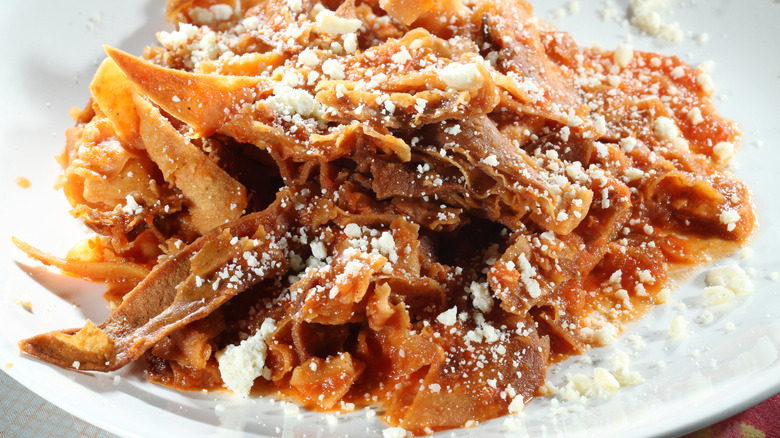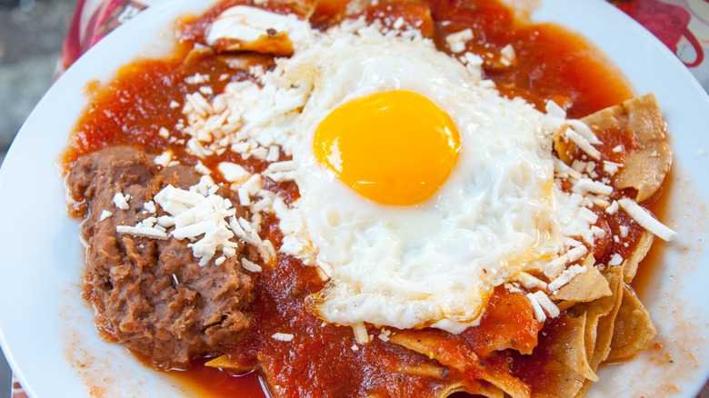 Traditionally, recipes for chilaquiles have been handed down for generations, along with ingredients and cooking techniques that make each dish unique. For example, the owner of San Jose's Mexican restaurant in central Florida says that his mother made chilaquiles by setting leftover tortillas out in the sun until they were crisp, simmering them with broth, and topping them with salsa and cheese. It's not required for every chilaquiles recipe, but if you choose to add a fried egg for breakfast, it will pair well with the tortilla base.