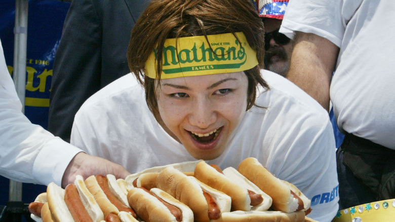 Takeru Kobayashi has been candid and outspoken about the fact that he's fully aware his chosen profession and sport comes with its fair share of risks, stating he's fully aware of the unhealthy side effects of what he does. The former competitive eater openly shares this, as well as his future plans to restore his health, in a recently aired Netflix documentary called "Hack Your Health: The Secrets of your Gut." Unlike flashy food-focused shows, this film explores the connection between gut health and the nutritional profiles of many American foods, as well as how our food choices can impact the bottom line of our health. We all know processed meats, including hot dogs, are far from a health-promoting food — it's hard to say where hot dogs come from, for one thing. Plus, the World Health Organization recently classified all processed meats as a Group 1 carcinogen, the same category as cigarettes.