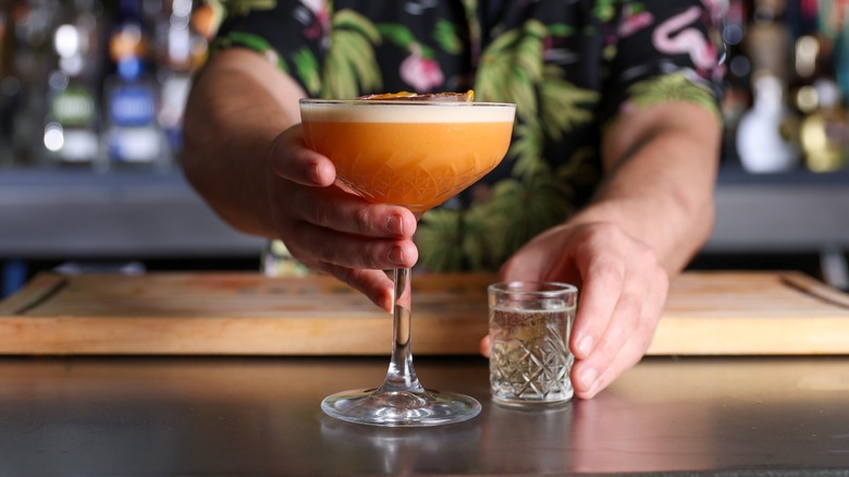 Equally as important, according to Ankrah, is that the prosecco not be mixed into the cocktail, either by the bartender or by the consumer. The pornstar martini is not a choose-your-own-adventure cocktail, but a composed drinking experience. "Whatever you do, don't mix the two together," warned Ankrah (via The Bartenders Broadcast Network). "What you do is you drink the martini and once in a while you clean your palate with the prosecco." Who would've thought a cocktail with such a risqué name would need to come with an instruction manual? The more you know!