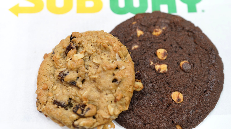 Sandwiches are the star of the show at Subway, but for many of us, there's another item just as worthy of our love and attention: cookies. Whatever your favorite kind of Subway cookie, these sweet treats are so popular that Subway has even released a footlong version of its chocolate chip cookie (plus footlong churros and pretzels). Unsurprisingly, the cookie is a popular item. Shortly after its early 2024 debut, the extra-large baked good had to be temporarily removed from Subway's app due to overwhelming customer demand.