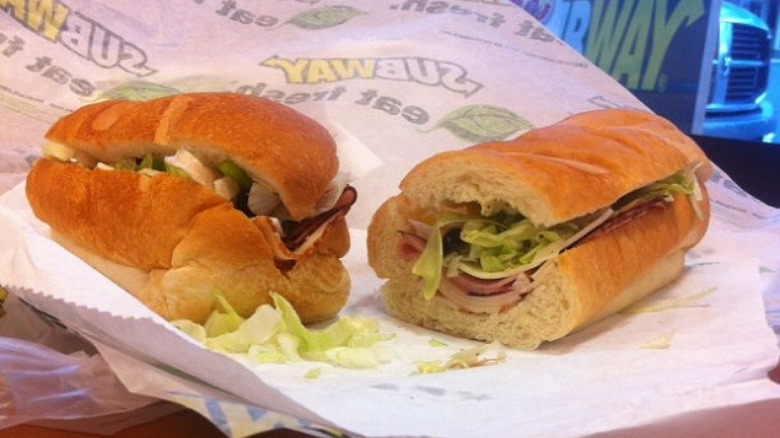 The caveat is that not every store will accommodate this hack. Each Subway franchise's policies may vary, but generally speaking, the meat(s) on either side of your footlong should be the same or similar. Otherwise, many Subway locations will charge you for two separate 6-inch subs. This trick is at least worth an ask, though. Rather Be Shopping points out that you might spend 20% less than you would when ordering two 6-inch subs.
