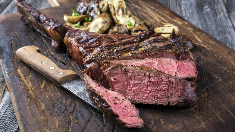 While Outback Steakhouse, the Australian-themed restaurant chain, may be best known for its Bloomin' Onion — a fried onion appetizer — the chain's steaks get a lot of love as well. The company began in Florida in the 1980s and grew to become the largest steakhouse chain in the country, and although we ranked it on the lower end of our list, it has its fans: The average Google review is a solid 4.1. Reviewers are especially effusive about the prime rib and ribeye steaks.