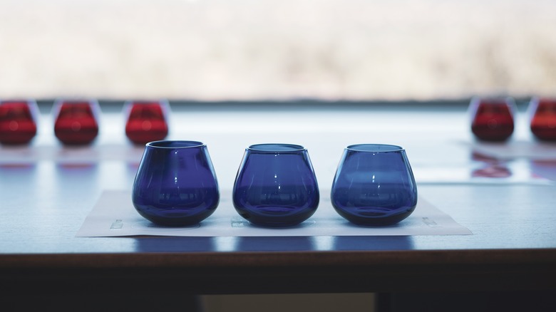 First, oleologists recommend you taste olive oil by itself rather than on a cracker or piece of bread to hone in on its distinctive flavors. As established oil taster Nicholas Coleman shared with Serious Eats, "At official tastings, we use opaque, blue stemless glasses. The color of the glass keeps tasters from being influenced by the color of the oil. The glass' shape is meant to fit perfectly in the palm of a hand, so we can warm the oil and release its aromas." Olive oil's color doesn't reflect its quality, but light negatively impacts it, which is why you should buy olive oil in tins rather than glass bottles.