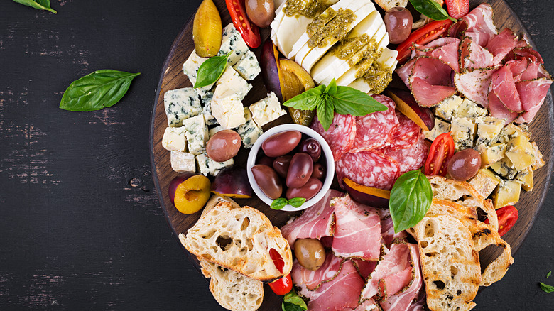 When you order an antipasto, you can expect to get a variety of cheese, cured meats, and vegetables alongside bread. Typical Italian items served as antipasto can vary depending on the region or type of restaurant you're eating at. For example, Sicilian antipasto might include caponata, a sweet and sour cold relish made with eggplant, onion, tomato, capers, raisins, and celery; other variations on this dish includes cured meats such as mortadella or salami and olives. In Florence, you might get a plate of prosciutto, crostini with liver pâté, fried polenta, and pecorino cheese. At an Italian restaurant in America or a holiday party, antipasto might be a combination of roasted red peppers, mozzarella and other cheeses, many kinds of cured meats, pepperoncini, and bruschetta.