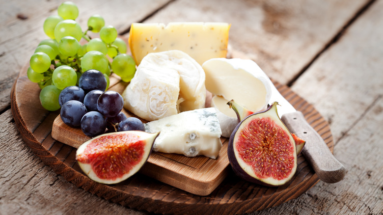 A few of the most popular and well-known Italian cheeses are Parmigiano Reggiano from the Emilia Romagna region, Pecorino (sheep's cheese — and it's basically made all over Italy), Caciocavallo from Sicily, Taleggio from Lombardy, Asiago, Grana Padano, ricotta salata, and gorgonzola. The fruits are likely fresh and regionally available. Pears and cheese pairs well together; other options include grapes, figs, apples, but berries and stone fruits can also go nicely depending on the kind of cheeses featured.