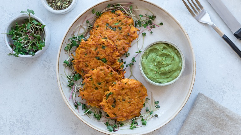 Finally, the original sweet potato pancake recipe calls for kosher salt. Substituting pink Himalayan salt for the kosher salt adds up to 84 trace elements and minerals to your dishes, (per Healthline). Use the pink stuff if you need a little more oomph in your daily mineral count.
