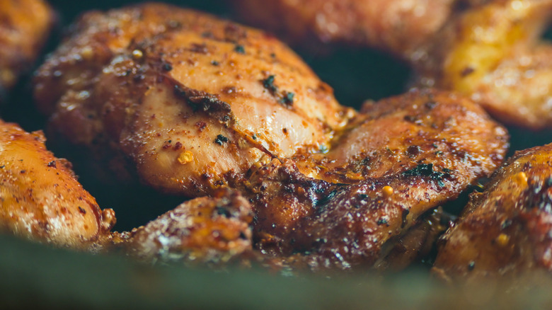 Another benefit of chicken thighs is that they're nearly impossible to overcook. Extremely forgiving, they stay juicy and tender no matter what you do to them. A great temp for thighs is 175 degrees Fahrenheit, but 185 degrees is even better, and 195 even better yet. In contrast, unless you've perfected the art of not overcooking chicken breasts, they're notoriously easy to dry out due to their lack of fat. Thus, for a more stress-free grilling experience, thighs are where it's at.