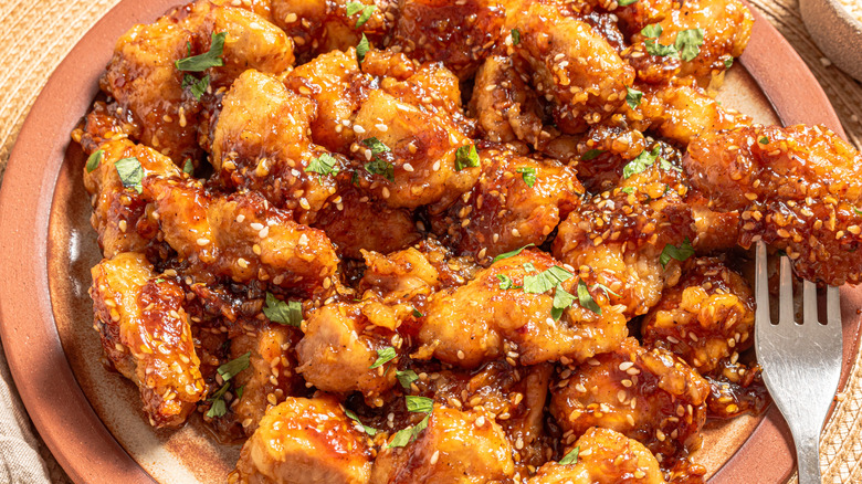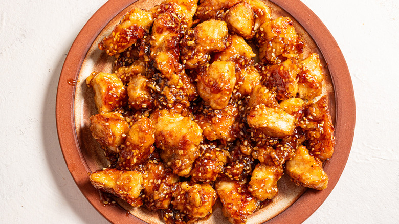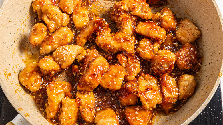To make this recipe in the air fryer, coat the chicken pieces with eggs and then the flour mixture and place them in a single layer in the air fryer basket. Cook for 10-12 minutes, and then take them out of the fryer and mix them with the sauce. Place a parchment paper inside the basket and return the coated chicken. Cook for 3-5 more minutes or until the sauce is thick and adhering to the chicken pieces.