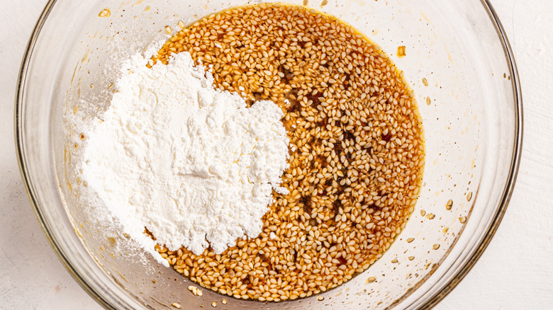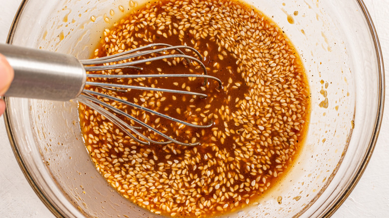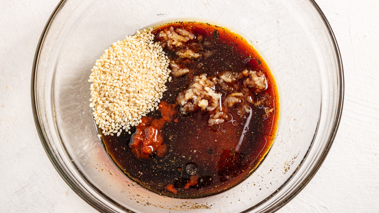 - In a bowl, combine the honey, soy sauce, sesame oil, rice vinegar, chili paste, minced garlic, and sesame seeds.