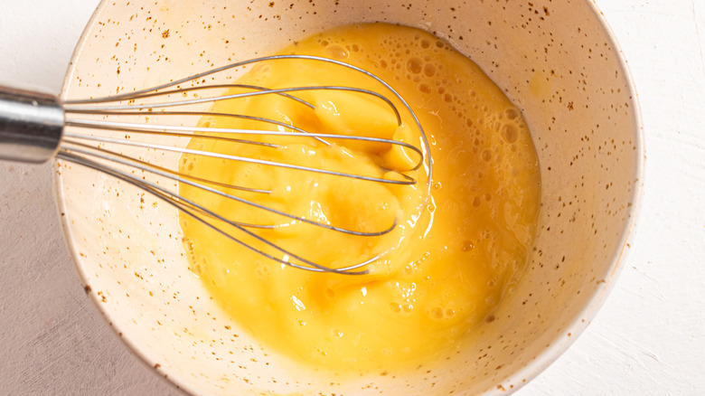 Working in batches, dredge the chicken in the eggs and then in the flour.