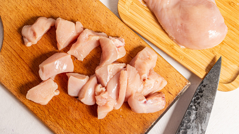 Pour the sauce over the chicken and stir until all the chicken pieces are coated.