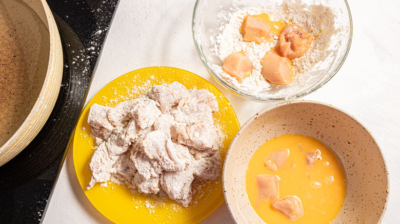 - Working in batches, dredge the chicken in the eggs and then in the flour.