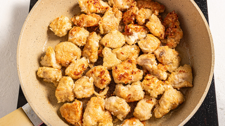 - Once the oil is hot, add the chicken to the skillet and cook until golden brown, about 10 minutes.
