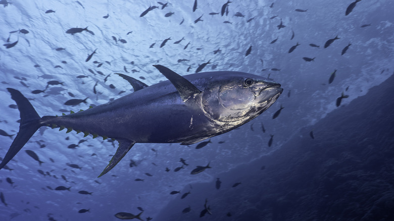 Despite their similar names, yellowfin tuna shouldn't be confused with yellowtail fish (also called amberjack), which isn't a tuna. Yellowfish is used for "hamachi" sushi and is pale white with a sweet, buttery taste. Try not to mix up all these fish with colors in their names — they're entirely different species.