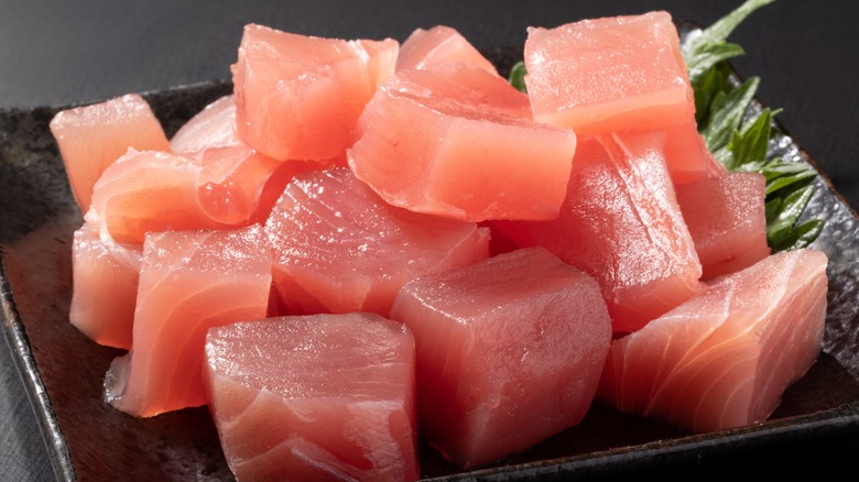 There's a lot you need to know if you're hoping to eat sushi like a pro. For example, you'll need to learn your different types of tuna. The term "tuna" refers to a fairly large family of fish that covers about 15 separate species. In the world of sushi, yellowfin and bluefin are the two most popular types of tuna, and their meat looks and tastes entirely different from one another.