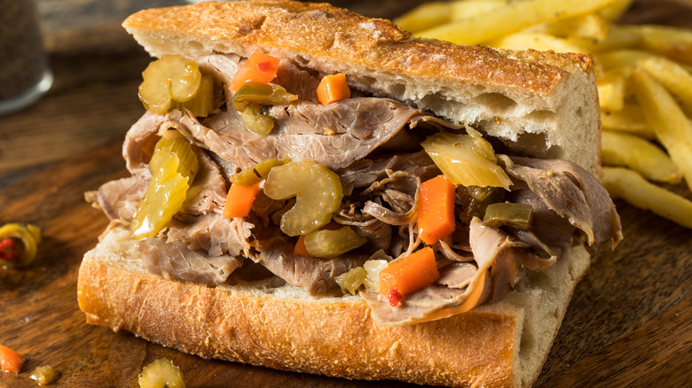 Most people outside of Chicago associate the Windy City's cuisine with two dishes. First and foremost, there is Chicago deep-dish pizza, ever the center of "is it really pizza" debates. Right behind it is the Chicago-style hot dog, famed for its ardent anti-ketchup stance. It's curious how these two dishes came to define the perception of Chicago cuisine, and it must in no small part be due to the fact that they are often framed as rivals of New York City's own pizza and hot dogs. In truth though, neither deep-dish pizza nor hot dogs is the true Chicago signature. Ask the locals, and they will almost surely give that title to the Italian beef.