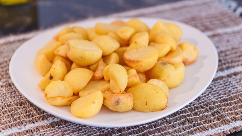 Like most canned fruits and veggies, the potatoes come in water and will be loaded with moisture. To help them crisp rather than steam, dry the potatoes the best you can with a paper towel to remove any water from the exterior. Before cooking them, season the potatoes as desired; salt and pepper are both fine, but you can also add some spice with paprika or even a little chipotle powder. Then, they'll need to cook on pretty high heat; set the air fryer to 400 degrees Fahrenheit, and give the potatoes about 15 minutes. When they're done, it will be hard to tell they ever came from a can.