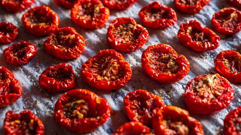 There's little prep beyond simply rinsing, drying, and cutting the tomatoes in half (or into slices if you've opted for one of the larger types), and you can enhance their taste by tossing them in sea salt and your favorite olive oil (herbs, too) before placing them cut-side up in the cooking chamber. Expect to wait around 75 minutes for drying to complete at around 240 degrees Fahrenheit. However long you dry them, remember to pause halfway through to gently squish the tomatoes with a fork, spatula, or potato masher to squeeze out any remaining liquid. Cool before storing them in the fridge (in olive oil or just an airtight container) for a few weeks.