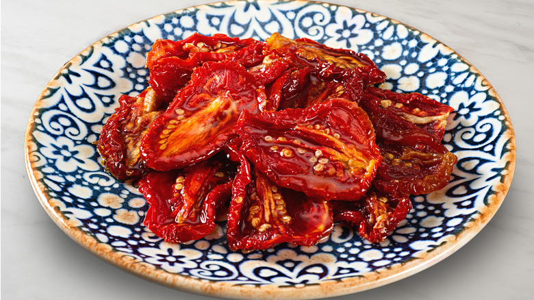 Sun-dried tomatoes may be small – they're about 90% or so lighter than the fresh form – but boy do they hit above their weight flavor-wise. Their famously concentrated and sweetly tangy profile is the result of having had the bulk of their moisture removed, something that was traditionally done by laying the fruits out on rooftops to bake under the intense heat of the southern Italian sun (hence their name). The drying process gives the fruit a chewy, almost leather-like texture, which, together with their punchy flavor, has made sun-dried tomatoes a beloved ingredient throughout the Mediterranean and beyond. (They're one of Gordon Ramsay's secret weapons for delicious tomato soup.) Because the rooftop method can take days to deliver results, people often make them in an oven or a dehydrator. However, there's an even quicker way to whip up this staple flavor-boosting ingredient: the air fryer.