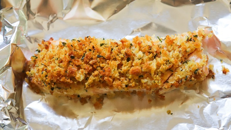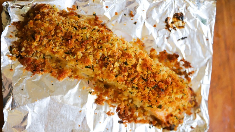 Bake until breadcrumbs are browned and salmon is cooked through, about 15 to 16 minutes. Let it rest for a few minutes and serve.