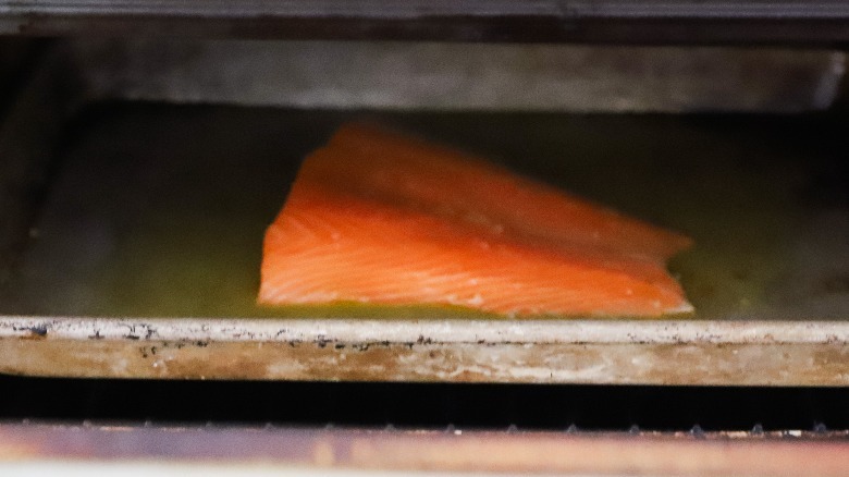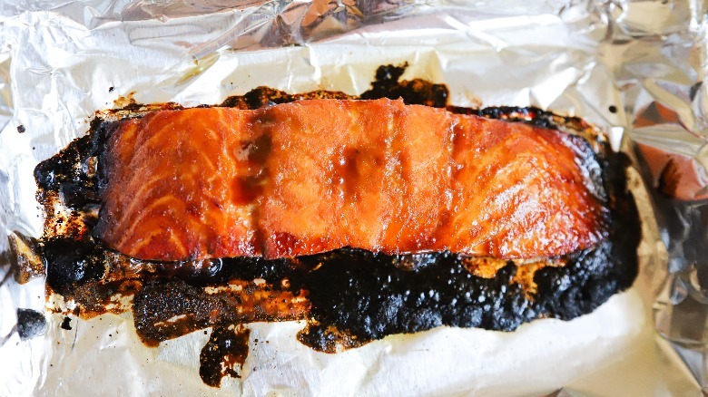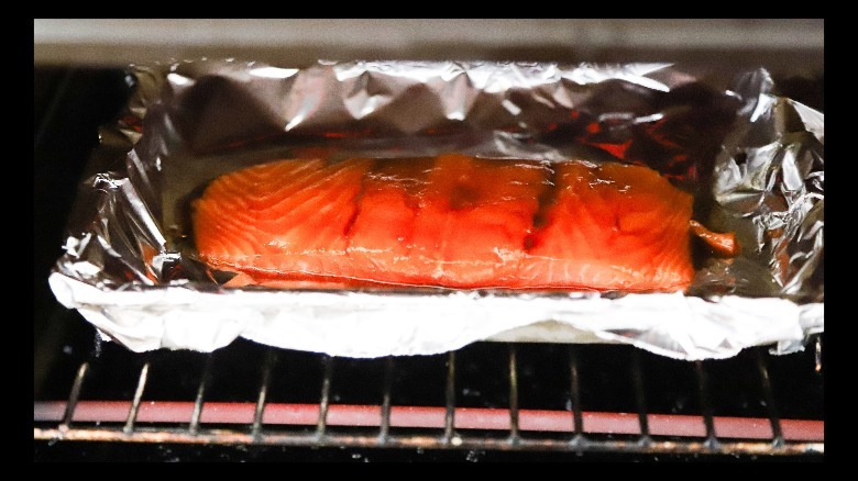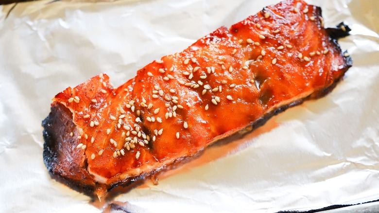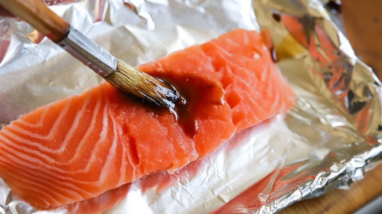 The third option for baking salmon in the oven is to utilize a glaze. A glaze is a sauce that has a sugar content on the higher side, using sugar, honey, agave, or even fruit juice to accomplish that. Sugar helps kickstart the Maillard browning process, which gives the salmon a wonderful texture and golden brown color. Baking salmon with a glaze shouldn't take much longer in the oven, so start checking it after about 15 minutes.