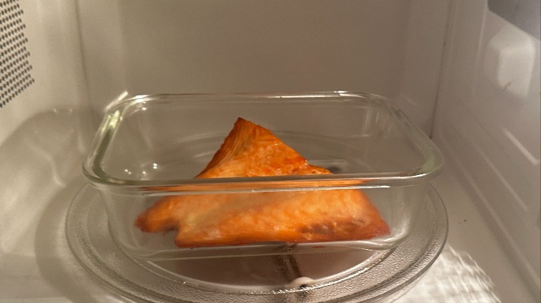 You can also use the microwave to reheat salmon, but be aware that this method can detrimentally affect the texture and will more than likely cause there to be hot spots in the fish. Heat covered in 30-second intervals until fish reaches desired temperature or doneness.