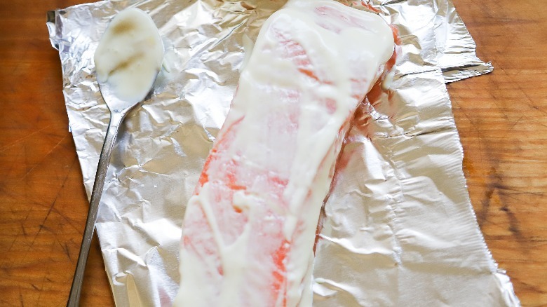 Using a spoon or rubber spatula, spread the sticking mixture on the filet.
