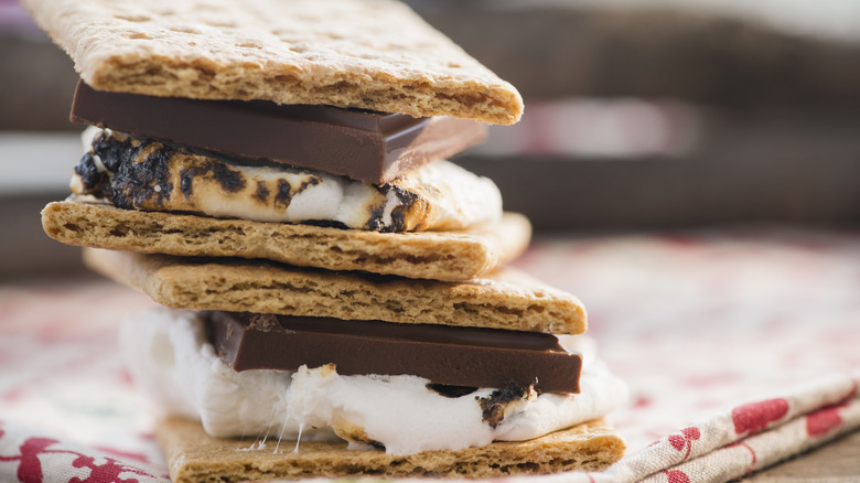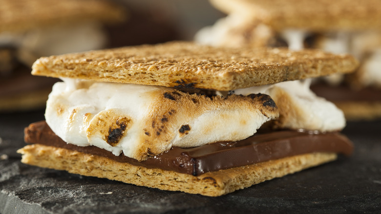 S'mores might seem like an unexpected food to air fry, but it actually works — marshmallows and chocolate are both delicate, though. They melt or burn easily, so pay attention when making this dessert. To start, you'll need a graham cracker base; this prevents the chocolate and marshmallows from sticking to the air fryer basket when they melt. You can also get creative and swap a graham cracker for a croissant. Then, add the marshmallow to the graham cracker and heat the air fryer to about 390 degrees Fahrenheit. Let it work its magic; the marshmallows will turn golden brown on top but remain melty and gooey underneath for the perfect texture.