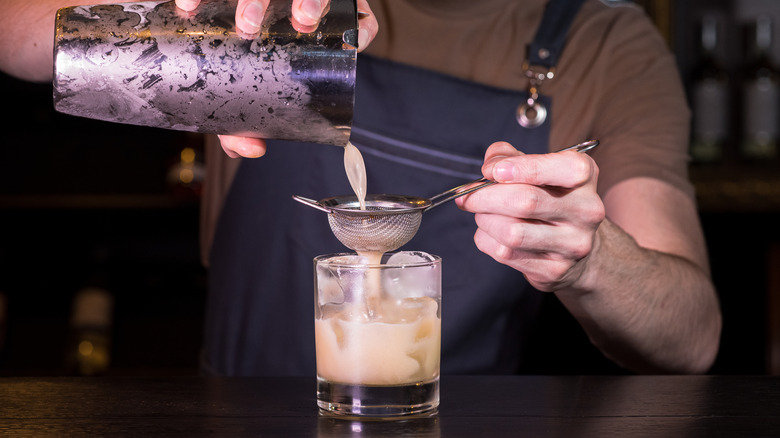 Typically, one fluid ounce of aquafaba (2 tablespoons) can replace a single egg white in a cocktail recipe. From there, simply follow the rest of the recipe's instructions. For example, if you're making a whiskey sour with aquafaba, toss the ingredients into a shaker without ice (this is called dry shaking) and give it a vigorous shake to properly aerate and mix the ingredients (try toasted sugar to make it even tastier), before adding ice and giving it a second shake. Pour into the glass, garnish, and serve.