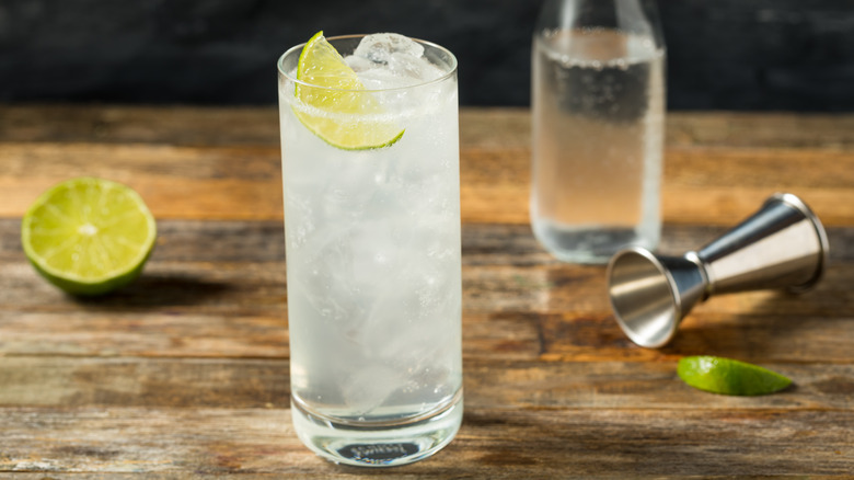 Because the ranch water is a more alcohol-forward drink than a margarita, it's important to choose a good tequila with a flavor profile you enjoy. There are several types of tequila, from unaged blanco (also known as silver) to ultra-aged Extra Añejo. Many of the individual distilleries also have unique approaches to this spirit, so there's plenty of options to suit individual tastes. This is in contrast to celebrity cook and cookbook author Ina Garten's use of cheap tequila for margaritas, because she believes the less complex flavors of an inexpensive blanco tequila pair better with the drink's other ingredients.