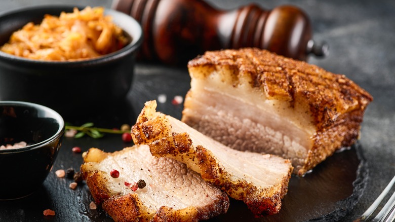 Before you start the cooking process, it's crucial to score the skin with a sharp knife. You may think this is purely a visual benefit, but it helps make the crackling as crunchy as possible by letting more heat into the skin. Just make sure you don't cut so deeply that you nick the meat itself, as this could cause it to dry out. You can also pat the skin dry as an extra step to help it crisp nicely.