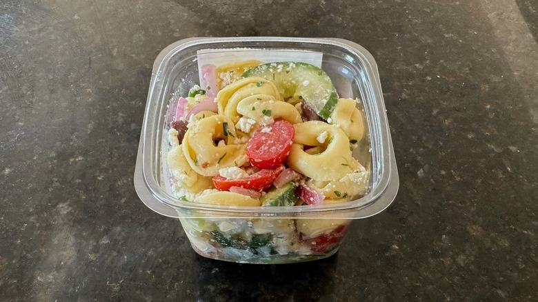 Unfortunately, Whole Foods seems to have fallen victim to one of the many pasta salad mistakes when it came out with its overly bland take on Greek food. The grocer's Greek tortellini pasta salad nails the incorporation of fruits and vegetables on the head with its use of cucumber slices, onions, and tomatoes. But somehow these ingredients still added up to a tasteless meal. Even with a citrusy olive oil dressing and an abundance of feta cheese sprinkled throughout the container, it simply wasn't enough. It didn't help that the tortellini itself didn't impress, as its parmesan stuffing wasn't detectable. Aside from the nutritional value that accompanies the pasta dish's mix of veggies, there aren't many reasons, flavor-wise, to choose this salad.