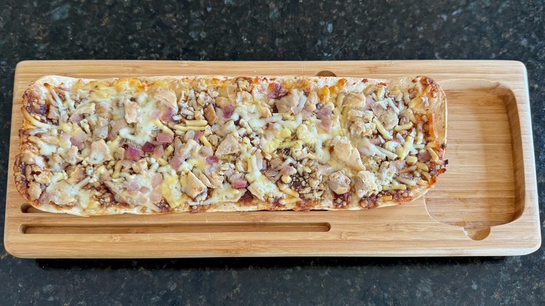 The only complaints about this item are that the chicken is a bit unevenly scattered and the crust is too thin. Yes, the latter can be expected considering flatbread is part of the product's name, but this is by far the flattest we've seen. It does make the bread a little flimsy under the weight of the ingredients while eating.