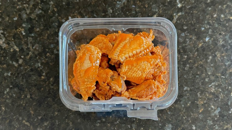Each piece is thoroughly coated in buffalo sauce, though some have more generous coverage than others. Regardless, the inconsistency doesn't affect anything at all, as every one of these seasoned wings still provides that classic, punchy flavor. There's zest, tang, heat, and that reliably creamy texture — all the essentials of good buffalo chicken.