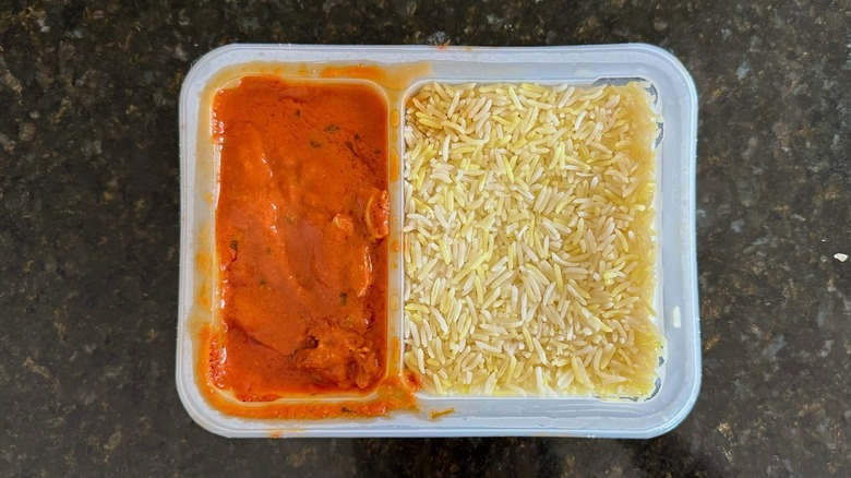 While the chain's ready-to-heat meal doesn't have quite the same authentic flavor and complex mix of spices you'd get from an Indian establishment, it'll absolutely still do the job to satisfy your cravings in a pinch. If you're not around a place that serves Indian cuisine or you simply want food on your plate faster, this is a solid option since it only needs three to five minutes in the microwave. The tray provides a generous sauce-to-rice ratio, allowing you to coat each grain with as much curry as you need. It doesn't skimp on the chicken either.