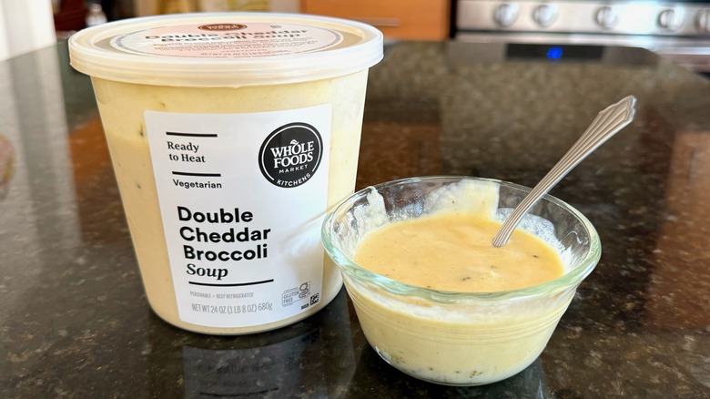 By doubling the cheese, though, we didn't realize that barely any broccoli would be included. There were only a few pieces of the green veggie to be found throughout the whole 24-ounce tub of soup. Yes, very fine specks of the broccoli's buds could be seen floating around but not nearly enough whole florets could be picked out. So if Whole Foods' double cheddar broccoli soup only really fulfills half of what the product advertises, it deservingly takes a spot halfway on this list.